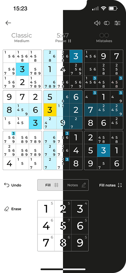 Do you want to play ‘A Game in Bed’ while your partner is sleeping? The dark game mode dims all colors, providing minimal light in a dark room while still allowing you to read all the Sudoku numbers clearly. Or, …, just use it as your default as our darkmode is pretty awesome.