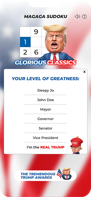 Make Every Day YUGE with ‘Every Day Magaga Day.’ It’s not just any day, it’s the day you triumph in intellect, the day you beat the puzzle, the day you’re simply the best – better than all the rest. Every single day, you’ve got the chance to display your genius, to show you’re a winner. With ‘Magaga Sudoku, the Trump Edition,’ every day is an opportunity to stand out, to be great, to be a champion. So don’t just play Sudoku, dominate it, every day. Because with Magaga, every day is your day to shine!